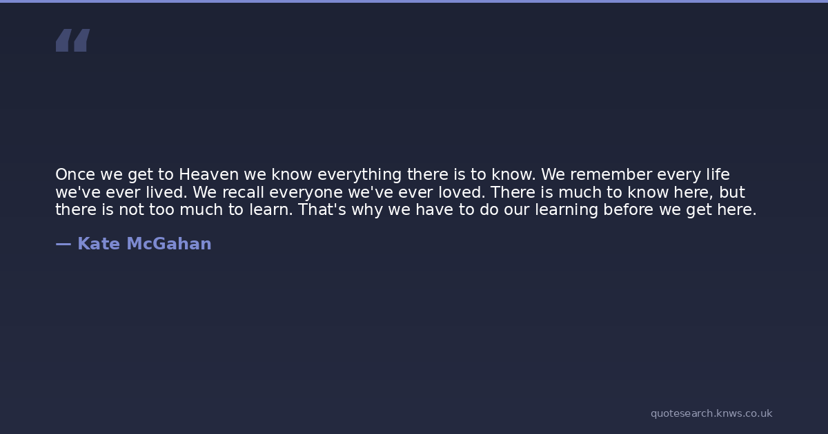 Once we get to Heaven we know everything there is to know. We remember every life we've ever lived. We recall everyone we've ever loved. There is much to know here, but there is not too much to learn. That's why we have to do our learning before we get here.