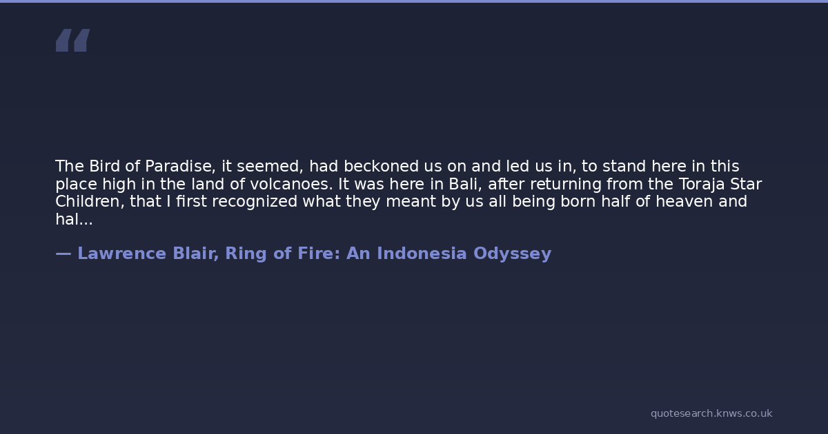 The Bird of Paradise, it seemed, had beckoned us on and led us in, to stand here in this place high in the land of volcanoes. It was here in Bali, after returning from the Toraja Star Children, that I first recognized what they meant by us all being born half of heaven and half of earth. And after the mounted warsports of Sumba it was in Balinese ritual that I saw with new eyes the battle for balance between light and darkness. And after Borneo, returning to the sacred Banyan tree and its simian custodians, I had felt that all great trees, whats left of them, do indeed link heaven and earth in a single forest of life.