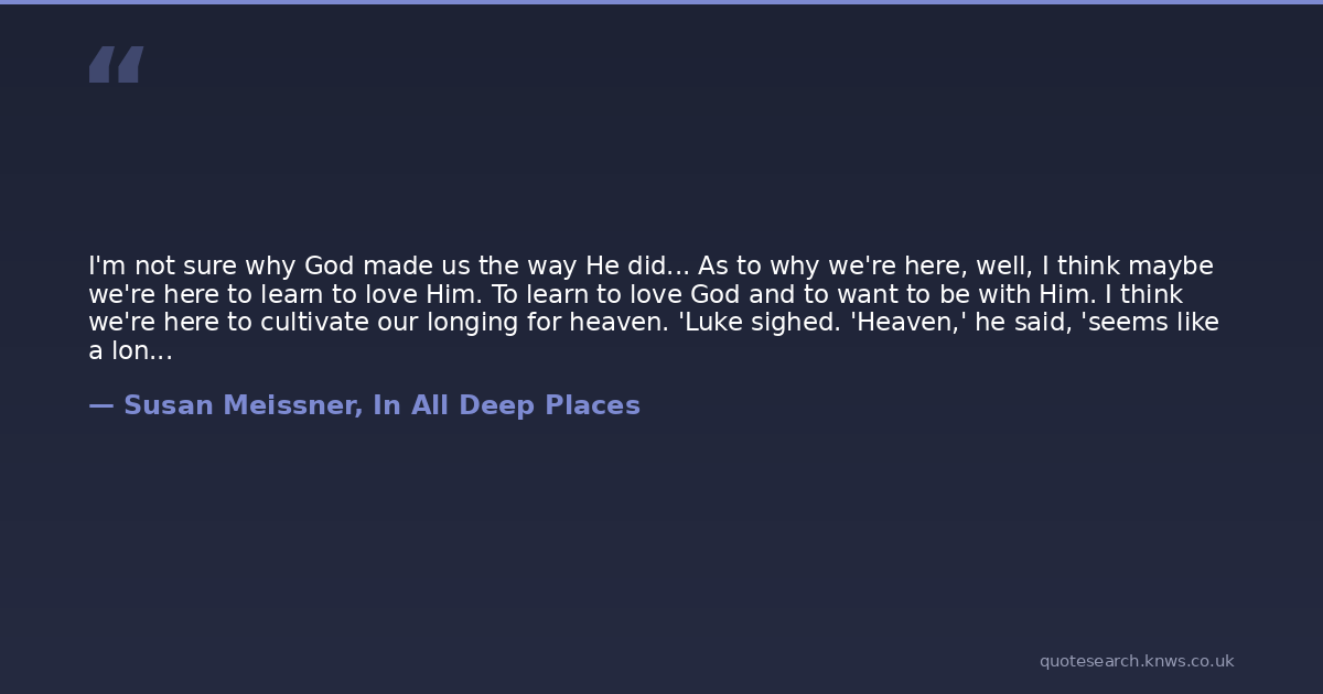 I'm not sure why God made us the way He did... As to why we're here, well, I think maybe we're here to learn to love Him. To learn to love God and to want to be with Him. I think we're here to cultivate our longing for heaven. 'Luke sighed. 'Heaven,' he said, 'seems like a long, long way off, Dad.'Jack nodded. 'It does. But I think God gives us glimpses of heaven from time to time to help up nurture the desire... I see glimpses every spring when the earth renews itself. And sometimes I see glimpses in a worship service when I'm singing about Jesus and all of a sudden I feel like I'm right there in His arms.