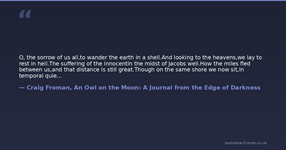 O, the sorrow of us all,to wander the earth in a shell.And looking to the heavens,we lay to rest in hell.The suffering of the innocentin the midst of Jacobs well.How the miles fled between us,and that distance is still great.Though on the same shore we now sit,in temporal quietude to wait.The moon is our bright witness;it will lead us to the gate.