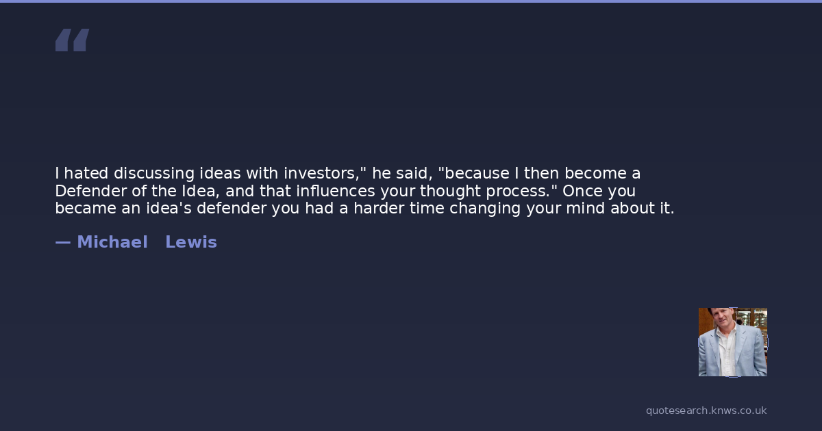 I hated discussing ideas with investors," he said, "because I then become a Defender of the Idea, and that influences your thought process." Once you became an idea's defender you had a harder time changing your mind about it.