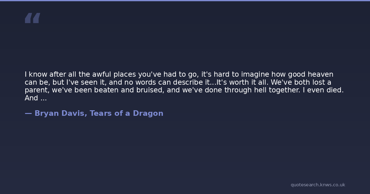 I know after all the awful places you've had to go, it's hard to imagine how good heaven can be, but I've seen it, and no words can describe it...It's worth it all. We've both lost a parent, we've been beaten and bruised, and we've done through hell together. I even died. And I can tell you...giving up everything to serve God is worth it all.