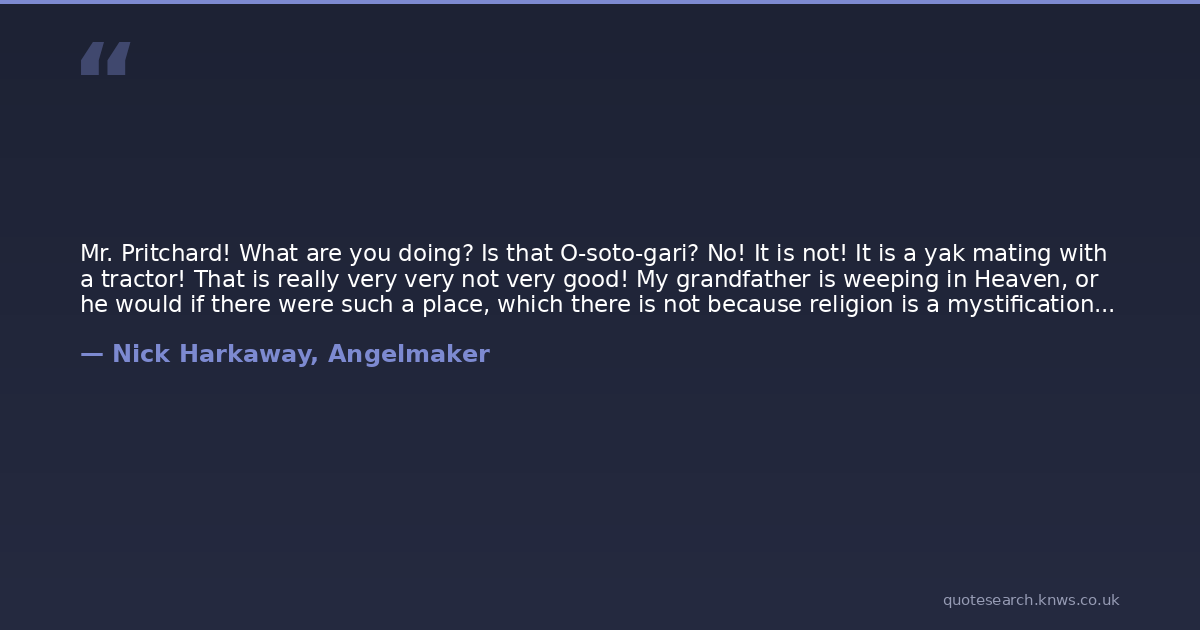 Mr. Pritchard! What are you doing? Is that O-soto-gari? No! It is not! It is a yak mating with a tractor! That is really very very not very good! My grandfather is weeping in Heaven, or he would if there were such a place, which there is not because religion is a mystification contrived by monarchists! Again! Again, and this time do it properly!