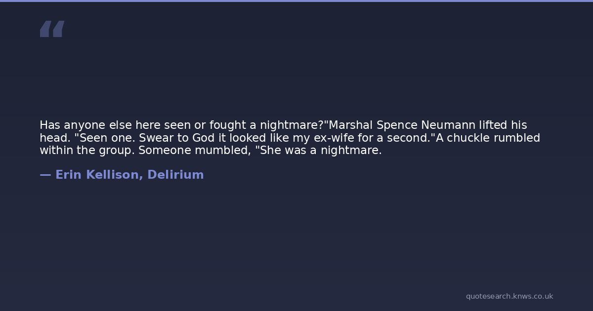 Has anyone else here seen or fought a nightmare?"Marshal Spence Neumann lifted his head. "Seen one. Swear to God it looked like my ex-wife for a second."A chuckle rumbled within the group. Someone mumbled, "She was a nightmare.
