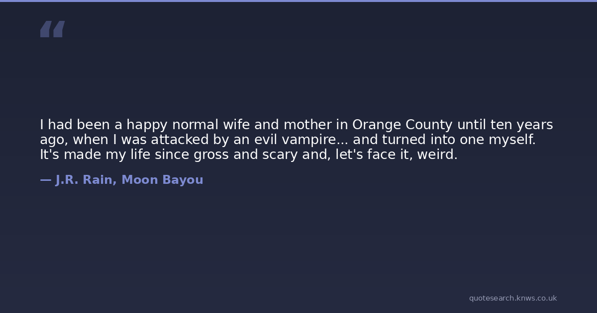 I had been a happy normal wife and mother in Orange County until ten years ago, when I was attacked by an evil vampire... and turned into one myself. It's made my life since gross and scary and, let's face it, weird.