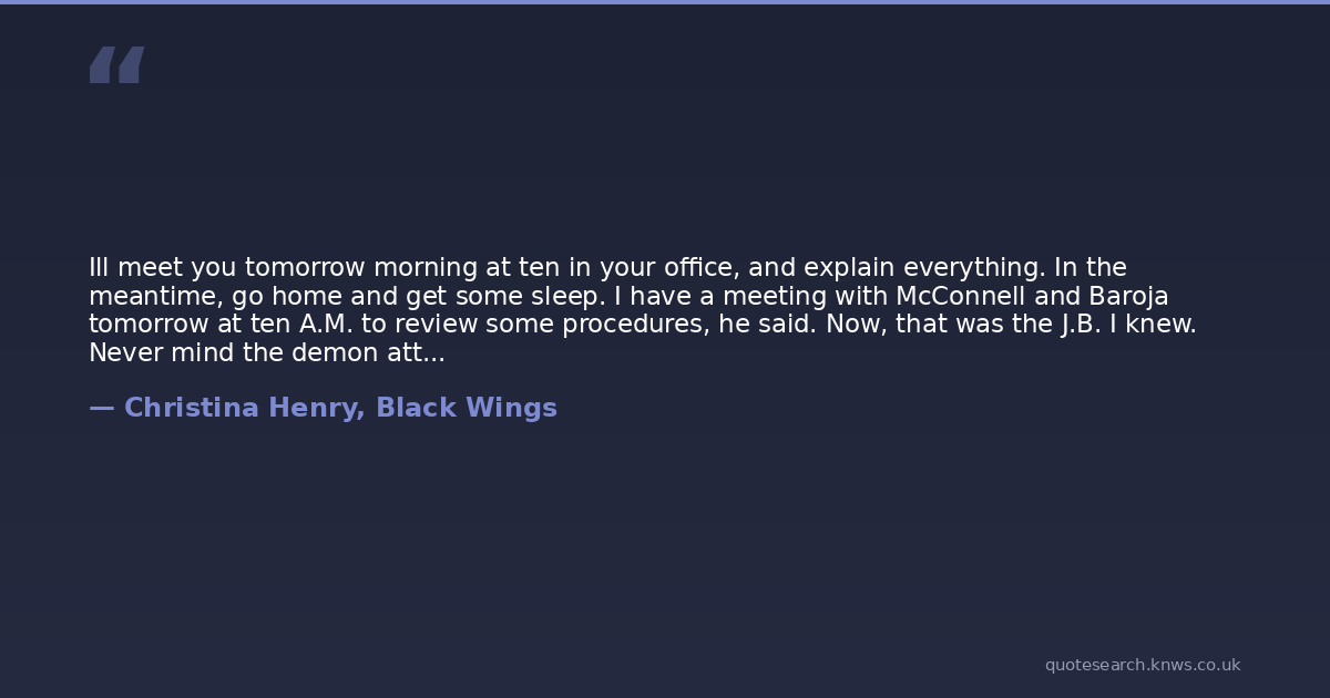Ill meet you tomorrow morning at ten in your office, and explain everything. In the meantime, go home and get some sleep. I have a meeting with McConnell and Baroja tomorrow at ten A.M. to review some procedures, he said. Now, that was the J.B. I knew. Never mind the demon attack; procedures needed reviewing.
