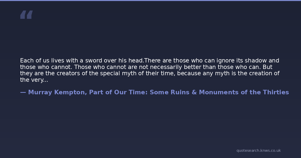Each of us lives with a sword over his head.There are those who can ignore its shadow and those who cannot. Those who cannot are not necessarily better than those who can. But they are the creators of the special myth of their time, because any myth is the creation of the very few who cannot bear reality.