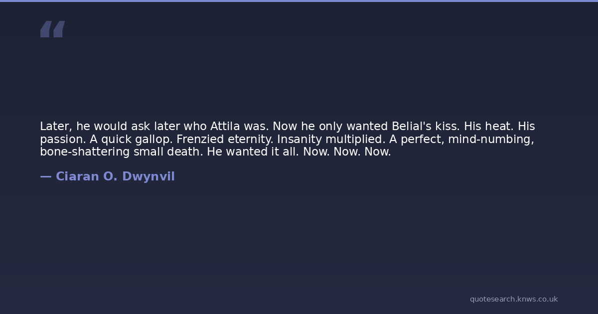 Later, he would ask later who Attila was. Now he only wanted Belial's kiss. His heat. His passion. A quick gallop. Frenzied eternity. Insanity multiplied. A perfect, mind-numbing, bone-shattering small death. He wanted it all. Now. Now. Now.