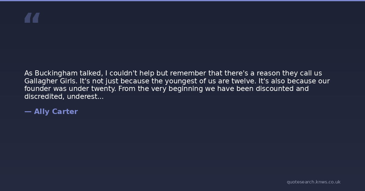 As Buckingham talked, I couldn't help but remember that there's a reason they call us Gallagher Girls. It's not just because the youngest of us are twelve. It's also because our founder was under twenty. From the very beginning we have been discounted and discredited, underestimated and undervalued. And, for the most part, we wouldn't have it any other way.