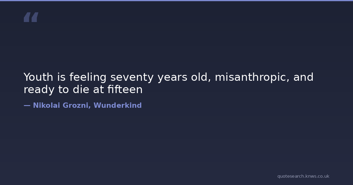 Youth is feeling seventy years old, misanthropic, and ready to die at fifteen nikolai-grozni wunderkind youth Download Image Share on X Share on Facebook Copy Link