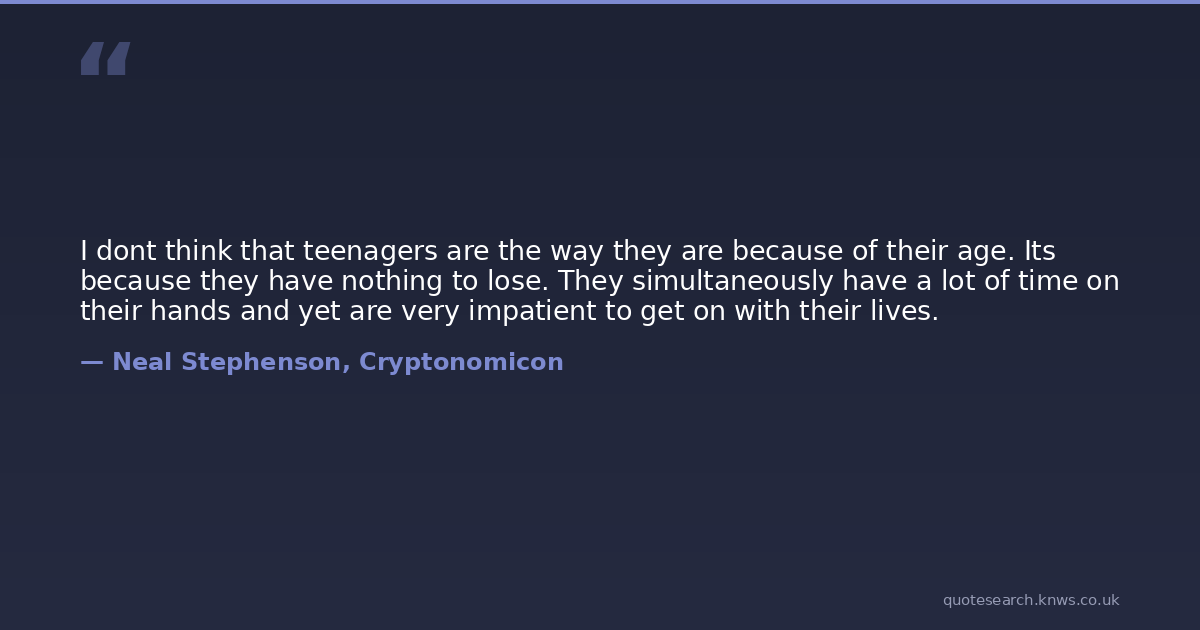 I dont think that teenagers are the way they are because of their age. Its because they have nothing to lose. They simultaneously have a lot of time on their hands and yet are very impatient to get on with their lives.