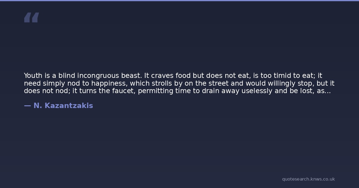 Youth is a blind incongruous beast. It craves food but does not eat, is too timid to eat; it need simply nod to happiness, which strolls by on the street and would willingly stop, but it does not nod; it turns the faucet, permitting time to drain away uselessly and be lost, as though time were water. A beast that does not know it is a beast - such is youth. (Report to Greco)