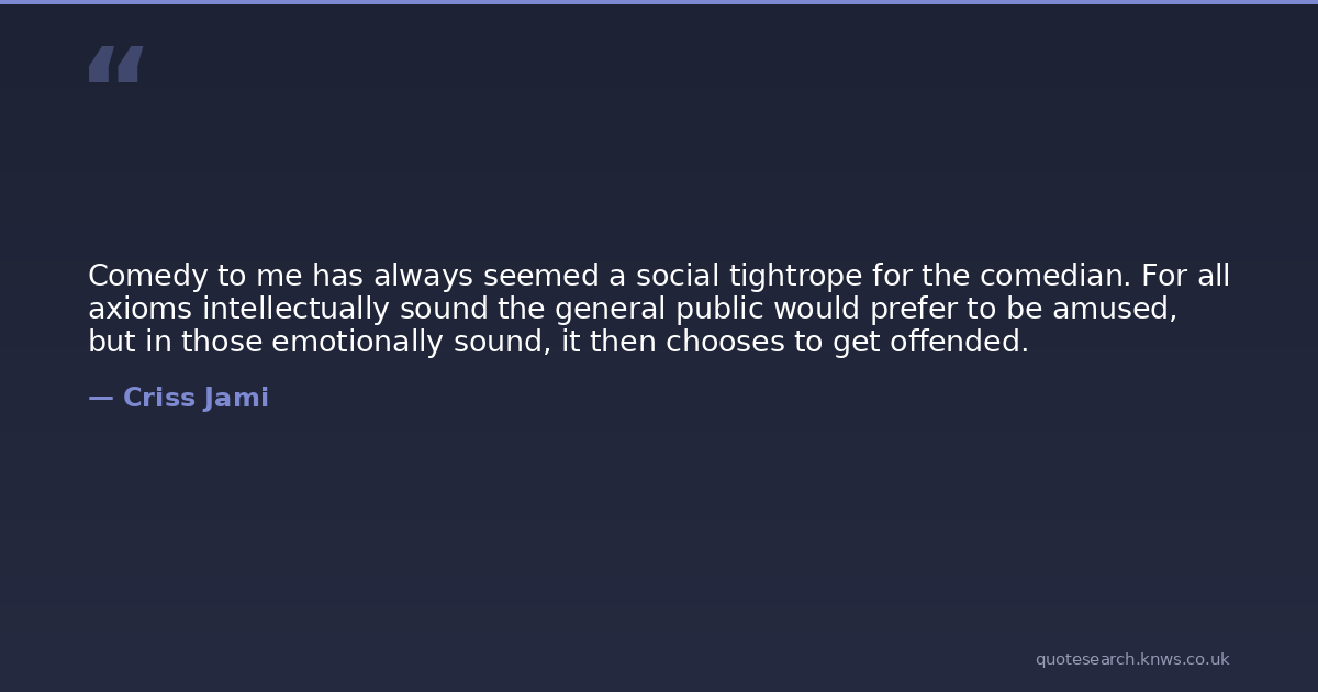 Comedy to me has always seemed a social tightrope for the comedian. For all axioms intellectually sound the general public would prefer to be amused, but in those emotionally sound, it then chooses to get offended.