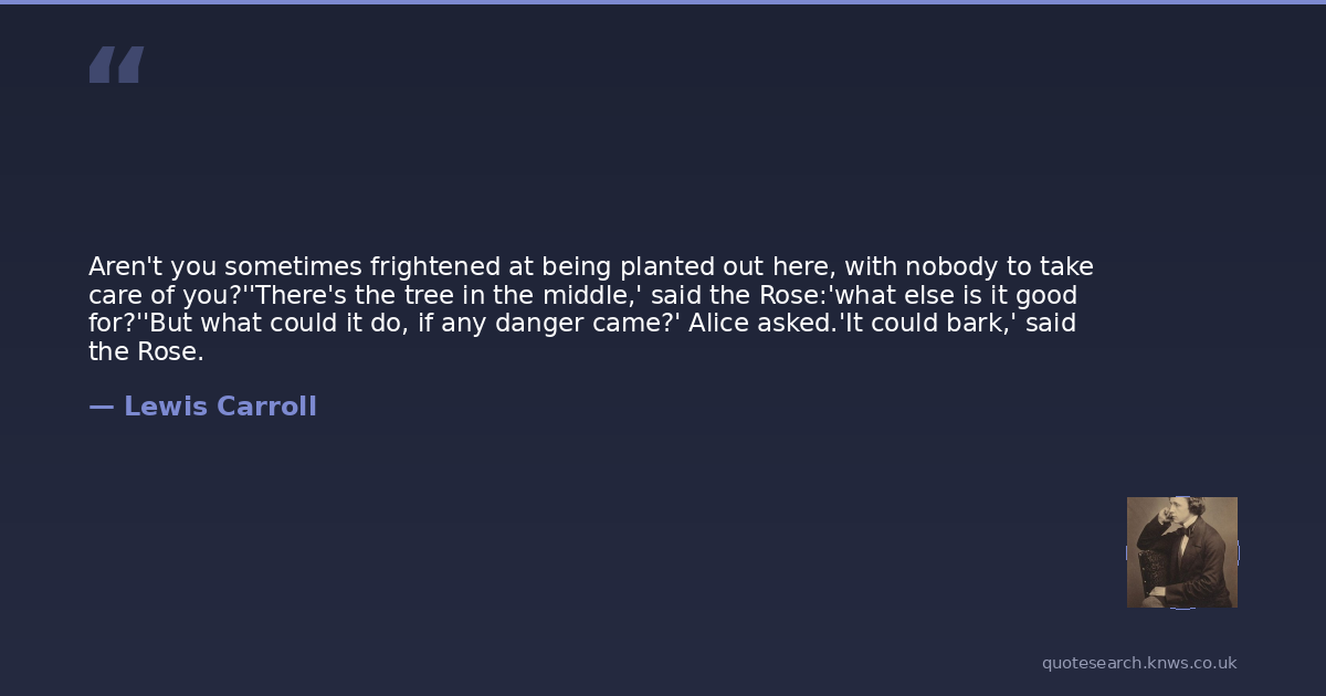 Aren't you sometimes frightened at being planted out here, with nobody to take care of you?''There's the tree in the middle,' said the Rose:'what else is it good for?''But what could it do, if any danger came?' Alice asked.'It could bark,' said the Rose.