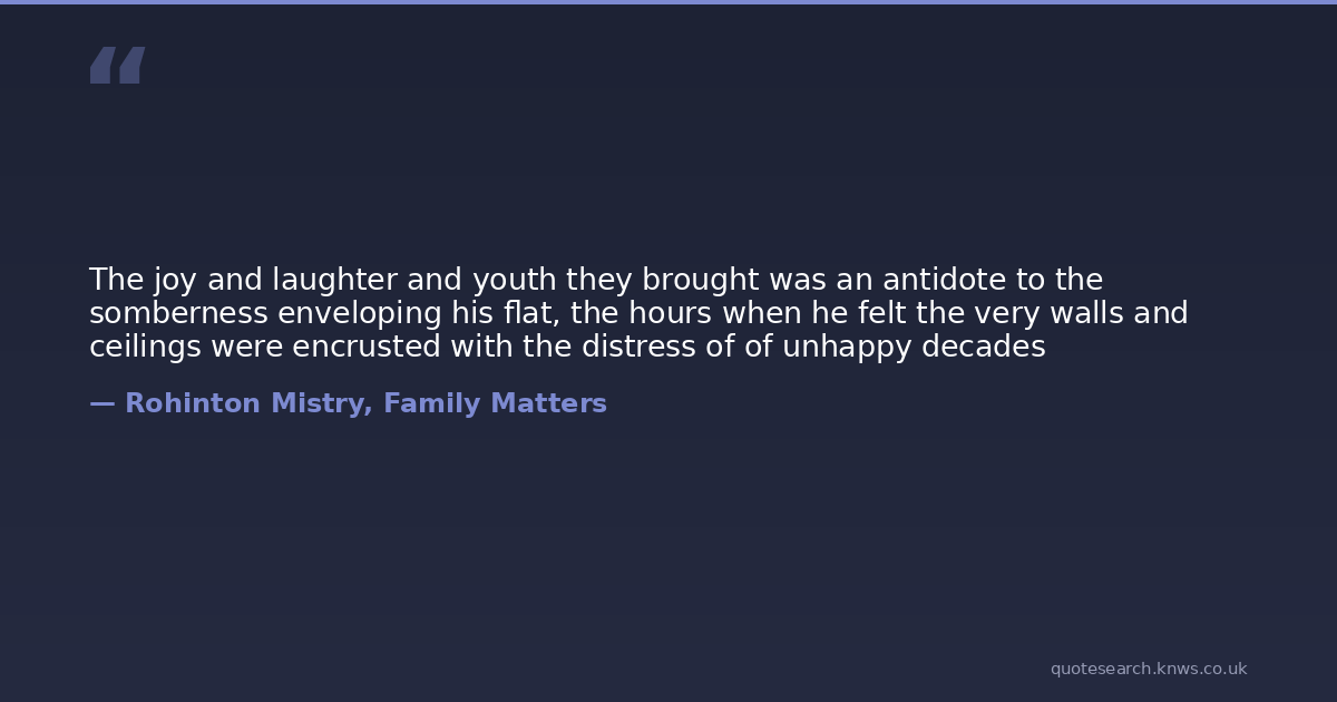 The joy and laughter and youth they brought was an antidote to the somberness enveloping his flat, the hours when he felt the very walls and ceilings were encrusted with the distress of of unhappy decades
