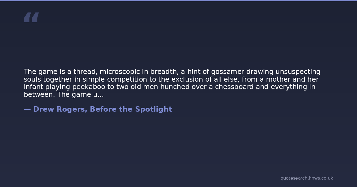 The game is a thread, microscopic in breadth, a hint of gossamer drawing unsuspecting souls together in simple competition to the exclusion of all else, from a mother and her infant playing peekaboo to two old men hunched over a chessboard and everything in between. The game unifies, joining father and son pitching baseballs at night after a long day at the office, pitches pounding the mitt or skipping past, one time even knocking the coffee cup handle clean off and the boy scampering off to retrieve a wild one as the dad sips and ponders. The game allows brothers to bond even when the age gap is too great for real competition, their mutual effort to fashion a bridge between disparate age and ability forming a bond of trust and respect. And finally, it is the games presence and past and its memory that inspires each of us to forgive time and aging and their inevitable accompanying attrition because the gray and hobbled old man before me was once lean and powerful and magnificent and some of what became of him was due to the investment he made in me and after all the batting practice he threw and grounders he hit, his shoulder aches and his knees need replacement. Even though youth masks it so you don't realize it all when youre a kid, someday it happens to you and suddenly you realize you are him and you are left wishing you could go back and tell him what you now know and perhaps thank him for what he gave up. You imagine him back then receiving nothing in return except the knowledge that you would someday understand but he could not hasten that day or that revelation and he abided it all so graciously knowing that your realization might be too late for him. So you console yourself that in the absence of your gratitude he clung to hope and conviction and the future. Turn the page and you find yourself staring out at the new generation and you wince as his pitches bruise your palm and crack your thumb and realize that today the game is growth and achievement and tomorrow it will be love and memories. The game is a gift.