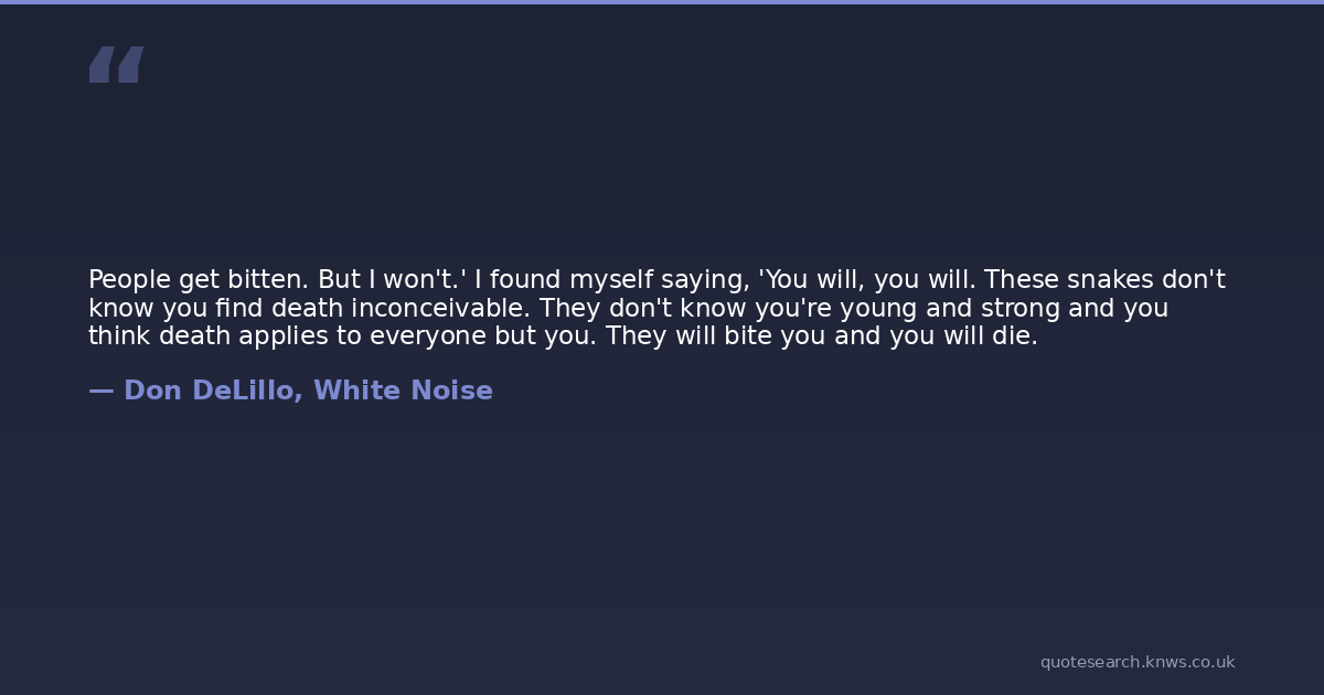 People get bitten. But I won't.' I found myself saying, 'You will, you will. These snakes don't know you find death inconceivable. They don't know you're young and strong and you think death applies to everyone but you. They will bite you and you will die.