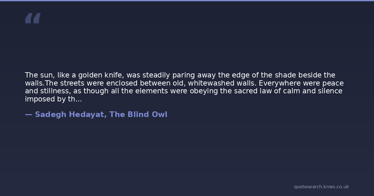 The sun, like a golden knife, was steadily paring away the edge of the shade beside the walls.The streets were enclosed between old, whitewashed walls. Everywhere were peace and stillness, as though all the elements were obeying the sacred law of calm and silence imposed by the blazing heat. It seemed as though mystery was everywhere and my lungs hardly dared to inhale the air.