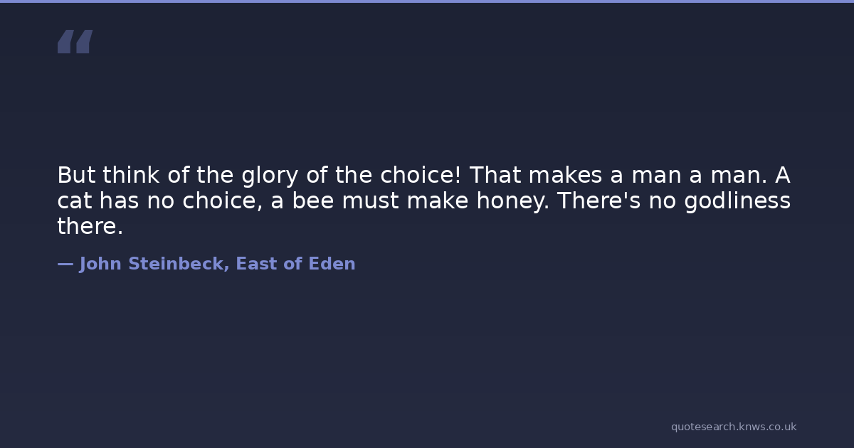 But think of the glory of the choice! That makes a man a man. A cat has no choice, a bee must make honey. There's no godliness there.