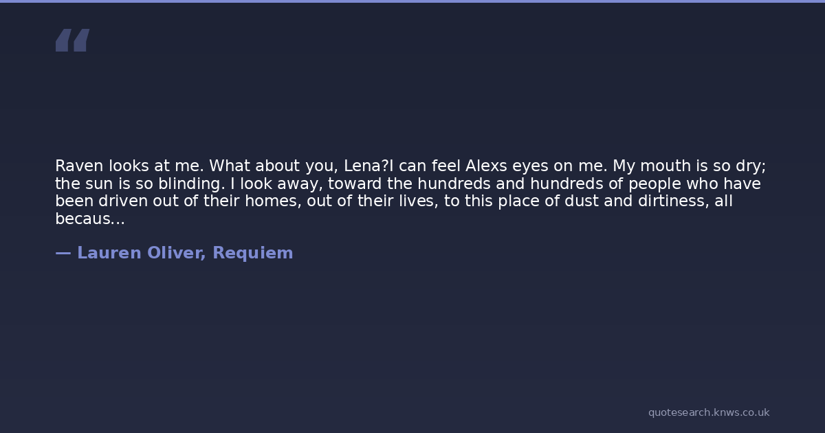 Raven looks at me. What about you, Lena?I can feel Alexs eyes on me. My mouth is so dry; the sun is so blinding. I look away, toward the hundreds and hundreds of people who have been driven out of their homes, out of their lives, to this place of dust and dirtiness, all because they wanted the power to feel, to think, to choose for themselves. They couldnt have known that even this was a liethat we never really choose, not entirely. We are always being pushed and squeezed down one road or another. We have no choice but to step forward, and then step forward again, and then step forward again; suddenly we find ourselves on a road we havent chosen at all.But maybe happiness isnt in the choosing. Maybe its in the fiction, in the pretending: that wherever we have ended up is where we intended to be all along.Coral shifts, and moves her hand to Alexs arm.Im with Julian, I say at last. This, after all, is what I have chosen.