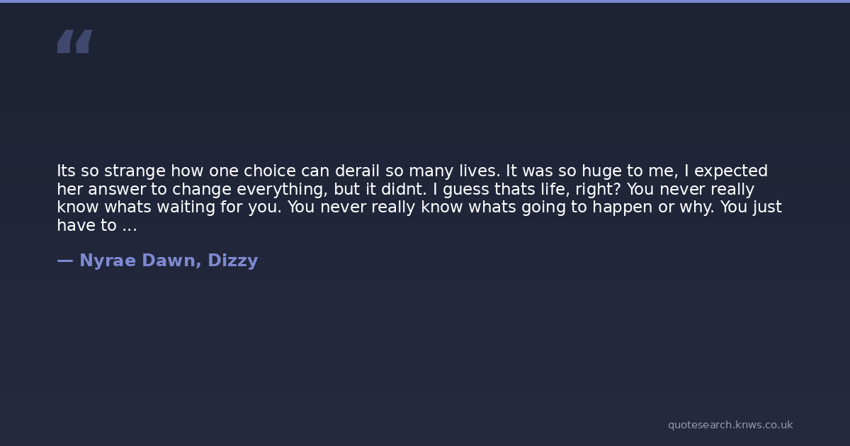 Its so strange how one choice can derail so many lives. It was so huge to me, I expected her answer to change everything, but it didnt. I guess thats life, right? You never really know whats waiting for you. You never really know whats going to happen or why. You just have to be able to deal with it. Big or small.