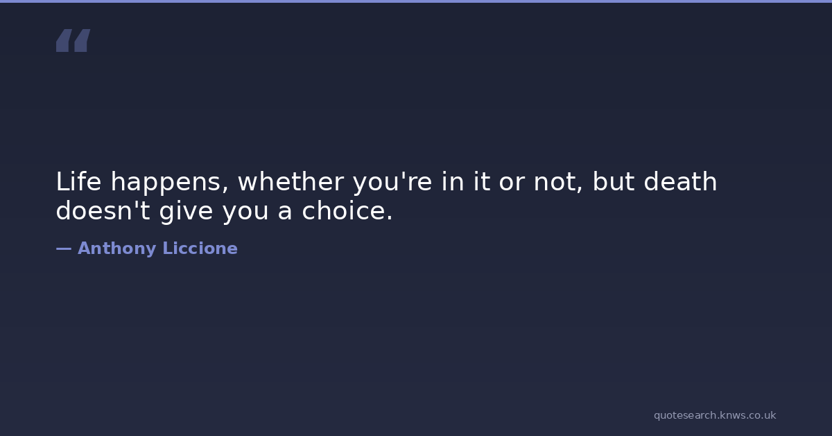 Life happens, whether you're in it or not, but death doesn't give you a choice. acceptance choice death in-or-out life no-choice rejection Download Image Share on X Share on Facebook Copy Link