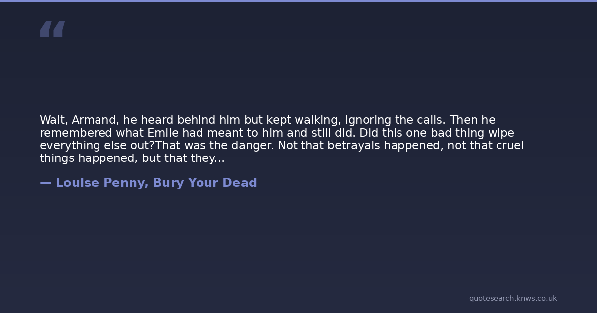 Wait, Armand, he heard behind him but kept walking, ignoring the calls. Then he remembered what Emile had meant to him and still did. Did this one bad thing wipe everything else out?That was the danger. Not that betrayals happened, not that cruel things happened, but that they could outweigh all the good. That we could forget the good and only remember the bad.But not today. Gamache stopped.