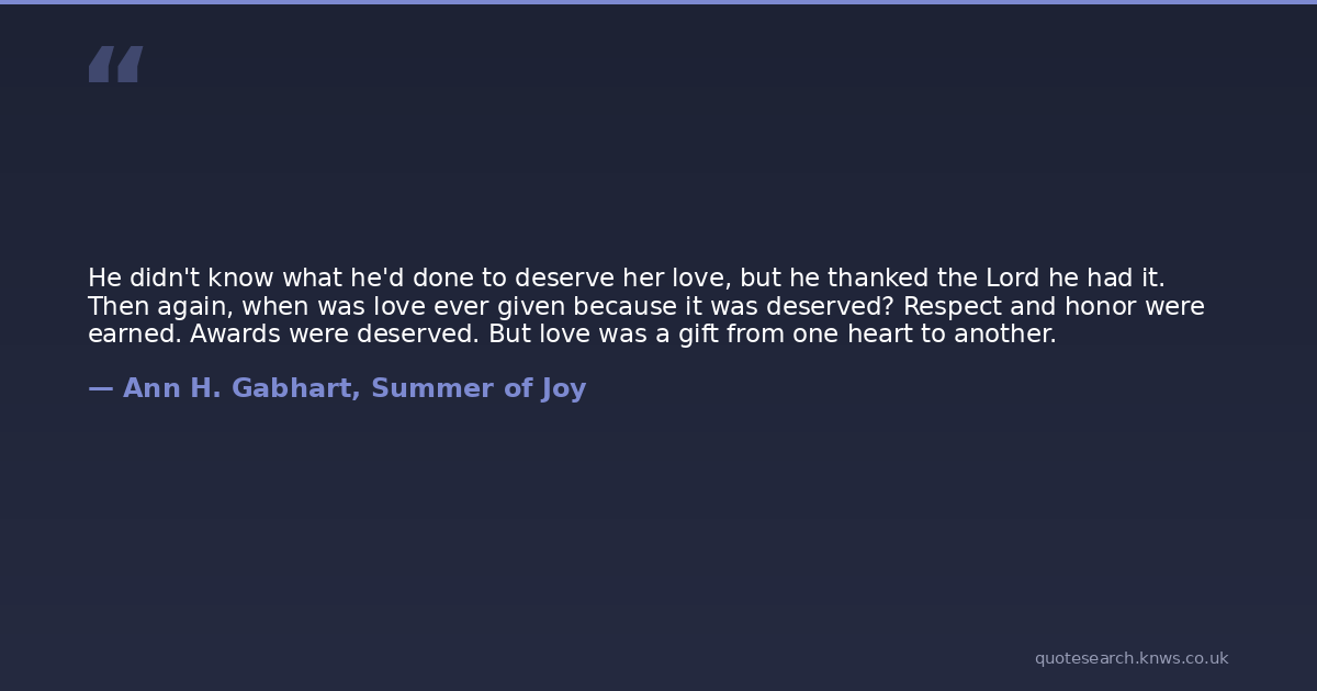 He didn't know what he'd done to deserve her love, but he thanked the Lord he had it. Then again, when was love ever given because it was deserved? Respect and honor were earned. Awards were deserved. But love was a gift from one heart to another.