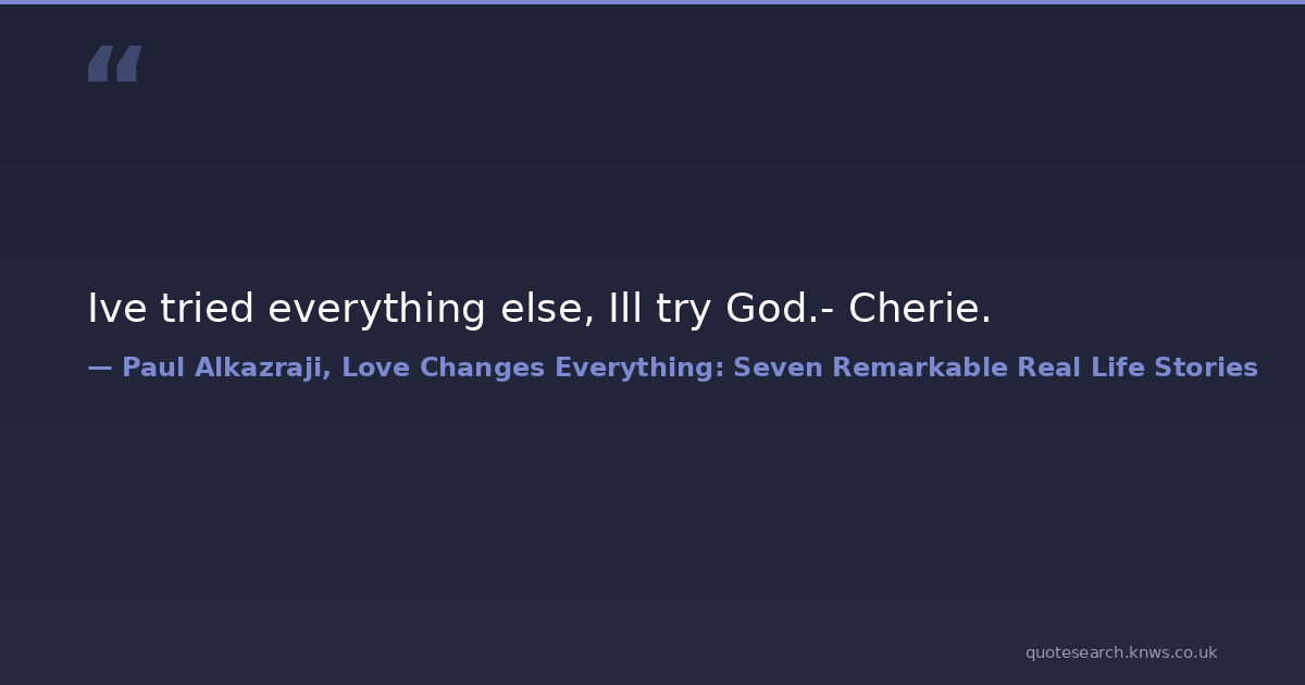 Ive tried everything else, Ill try God.- Cherie. christ christian christianity faith faith-in-god god religion religious Download Image Share on X Share on Facebook Copy Link