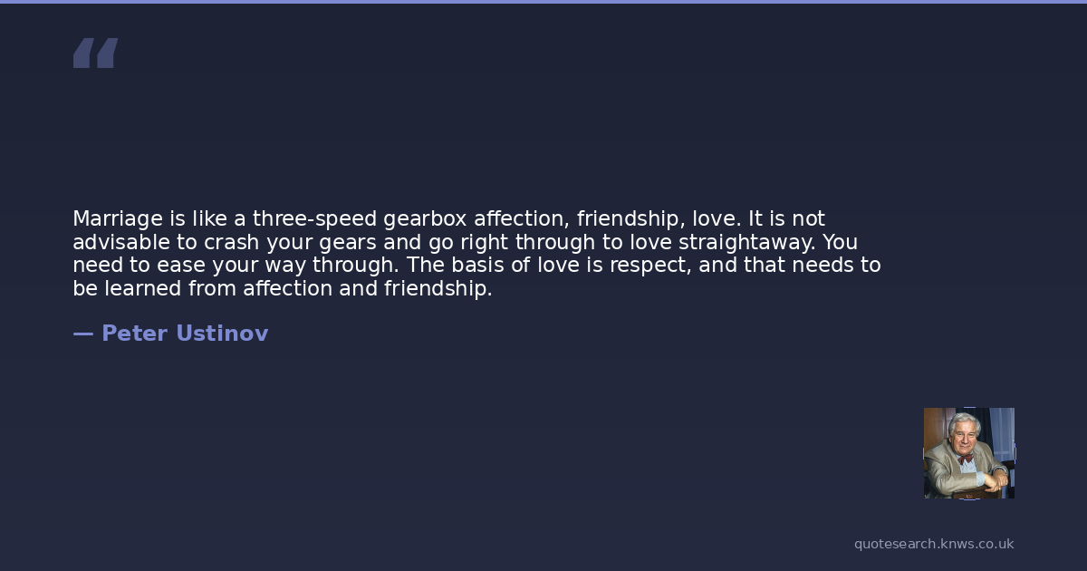 Marriage is like a three-speed gearbox affection, friendship, love. It is not advisable to crash your gears and go right through to love straightaway. You need to ease your way through. The basis of love is respect, and that needs to be learned from affection and friendship.
