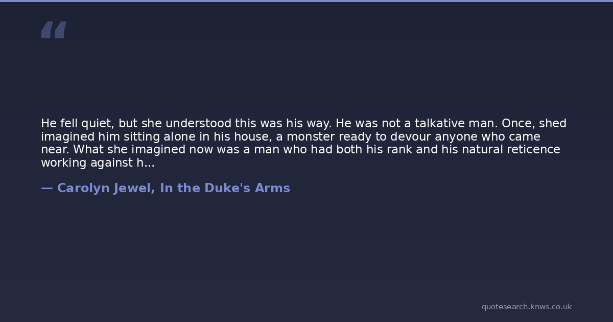He fell quiet, but she understood this was his way. He was not a talkative man. Once, shed imagined him sitting alone in his house, a monster ready to devour anyone who came near. What she imagined now was a man who had both his rank and his natural reticence working against him. She smiled at him. If he continued in his gruff ways the rest of his life, she would defend him to anyone. Anyone.