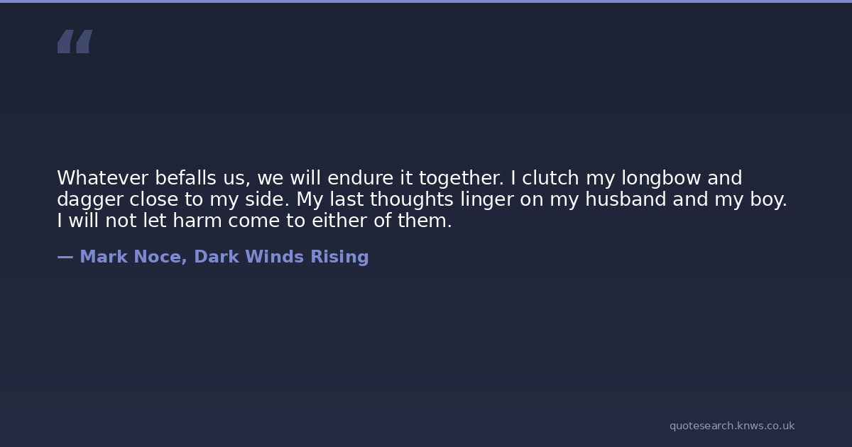 Whatever befalls us, we will endure it together. I clutch my longbow and dagger close to my side. My last thoughts linger on my husband and my boy. I will not let harm come to either of them.