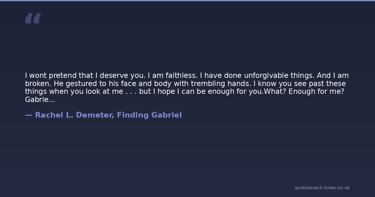 I wont pretend that I deserve you. I am faithless. I have done unforgivable things. And I am broken. He gestured to his face and body with trembling hands. I know you see past these things when you look at me . . . but I hope I can be enough for you.What? Enough for me? Gabriel, you are everything.