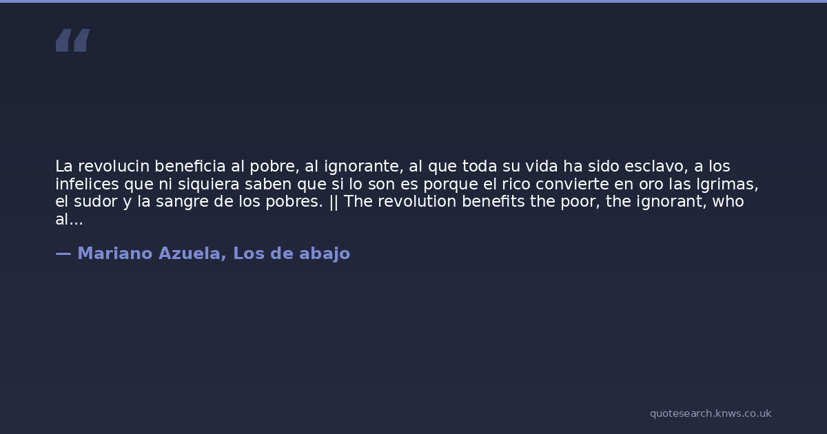 La revolucin beneficia al pobre, al ignorante, al que toda su vida ha sido esclavo, a los infelices que ni siquiera saben que si lo son es porque el rico convierte en oro las lgrimas, el sudor y la sangre de los pobres. || The revolution benefits the poor, the ignorant, who all his life has been a slave, the unfortunate who do not know if they are is because the rich becomes the tears, sweat and blood of the poor in gold.