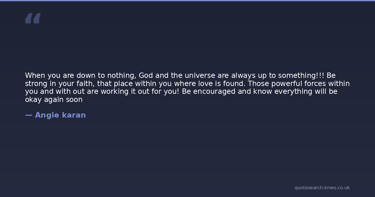 When you are down to nothing, God and the universe are always up to something!!! Be strong in your faith, that place within you where love is found. Those powerful forces within you and with out are working it out for you! Be encouraged and know everything will be okay again soon