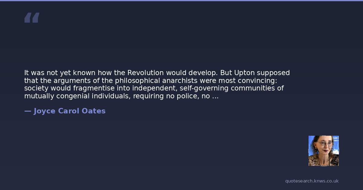 It was not yet known how the Revolution would develop. But Upton supposed that the arguments of the philosophical anarchists were most convincing: society would fragmentise into independent, self-governing communities of mutually congenial individuals, requiring no police, no army, no guardians of morality, and no government. The old Deity being dead and dethroned, Humankind would come at last into power.