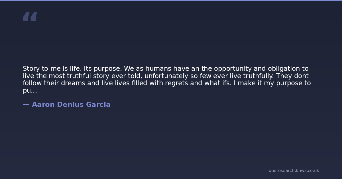 Story to me is life. Its purpose. We as humans have an the opportunity and obligation to live the most truthful story ever told, unfortunately so few ever live truthfully. They dont follow their dreams and live lives filled with regrets and what ifs. I make it my purpose to pursue the dreams and life that I want. Its very hard, but at the end of the day, when people read the story of my life, they will say, He was true to himself.