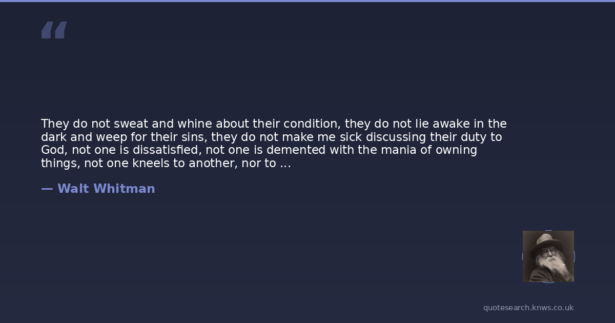 They do not sweat and whine about their condition, they do not lie awake in the dark and weep for their sins, they do not make me sick discussing their duty to God, not one is dissatisfied, not one is demented with the mania of owning things, not one kneels to another, nor to his kind that lived thousands of years ago.