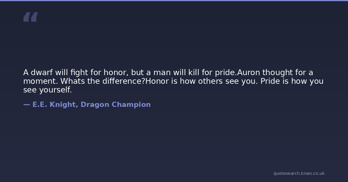 A dwarf will fight for honor, but a man will kill for pride.Auron thought for a moment. Whats the difference?Honor is how others see you. Pride is how you see yourself.