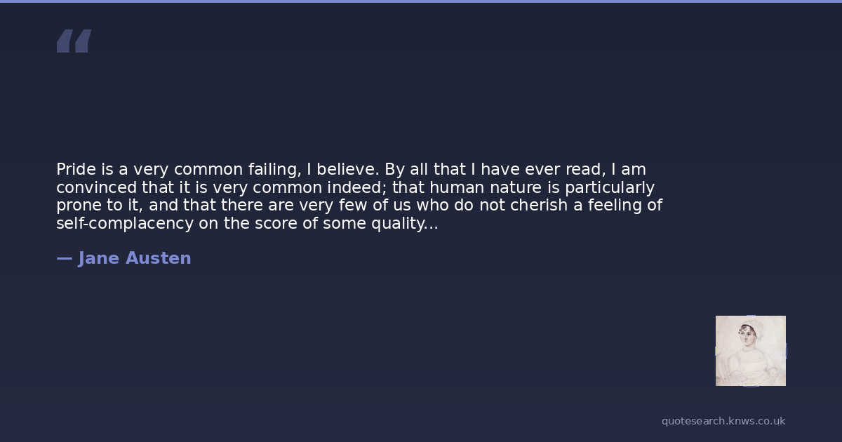 Pride is a very common failing, I believe. By all that I have ever read, I am convinced that it is very common indeed; that human nature is particularly prone to it, and that there are very few of us who do not cherish a feeling of self-complacency on the score of some quality or other, real or imaginary.