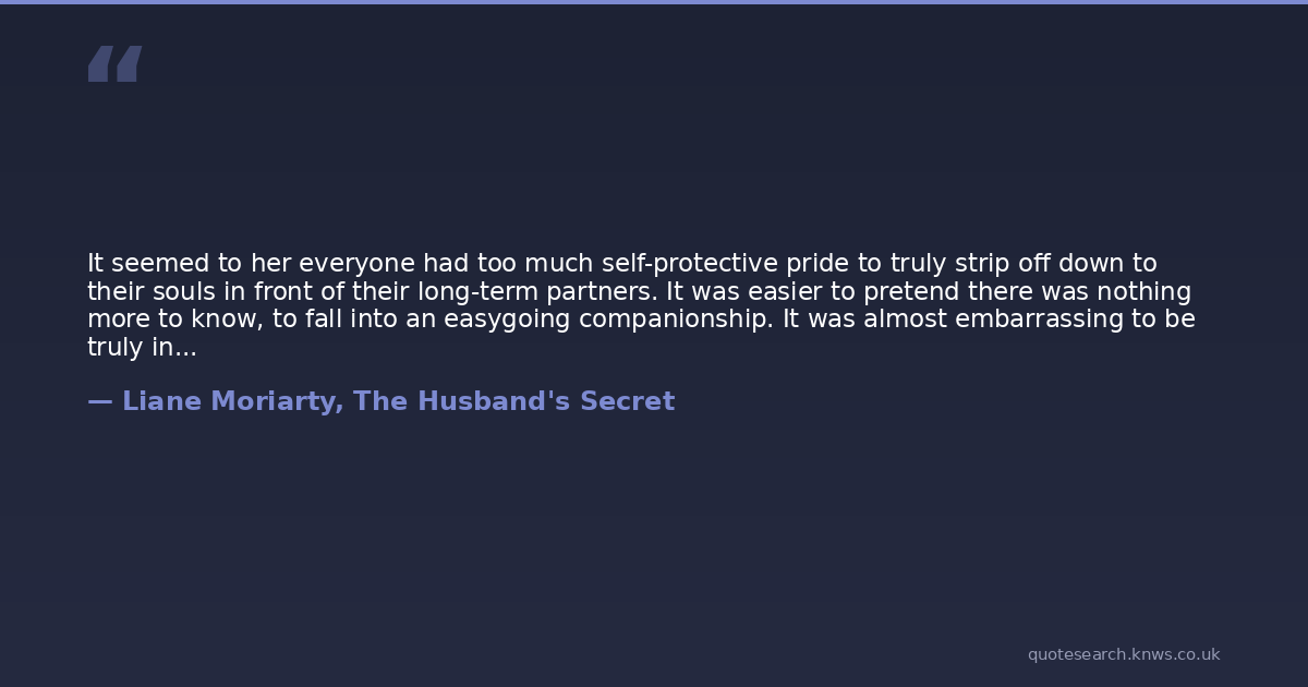 It seemed to her everyone had too much self-protective pride to truly strip off down to their souls in front of their long-term partners. It was easier to pretend there was nothing more to know, to fall into an easygoing companionship. It was almost embarrassing to be truly intimate with your spouse; because how could you watch someone floss one minute, and the next minute share your deepest passion or tritest of fears? It was almost easier to talk about that sort of thing before youd shared a bathroom and a bank account and argued over the packing of the dishwasher.
