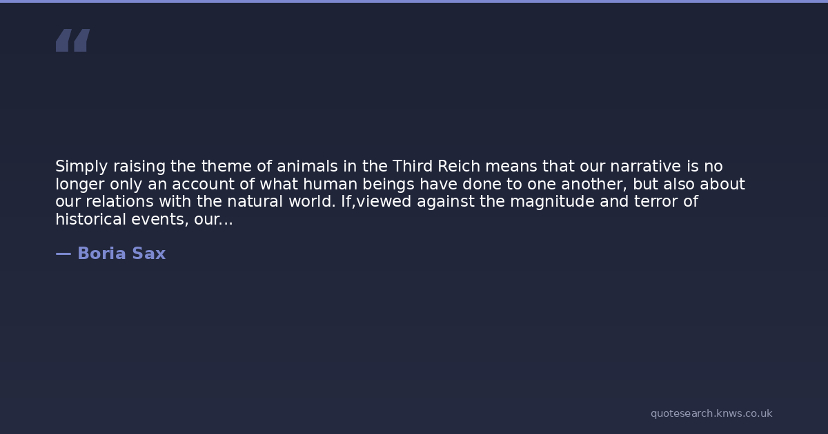 Simply raising the theme of animals in the Third Reich means that our narrative is no longer only an account of what human beings have done to one another, but also about our relations with the natural world. If,viewed against the magnitude and terror of historical events, our personal lives appear almost trivial, the lives of animals may seem more so, and evento raise the subject can at first seem either insensitive or pedantic. At thesame time, this new dimension places the events in an even vaster perspective still, one in which even the greatest battles and horrendouscrimes can begin to fade into insignificance. This is the standpoint of evolutionary time, in which humankind itself may be no more than arelatively brief episode. Perhaps the focus on animals may help us to finda more harmonious balance between the personal, historic, and cosmiclevels, on which, simultaneously we conduct our lives.