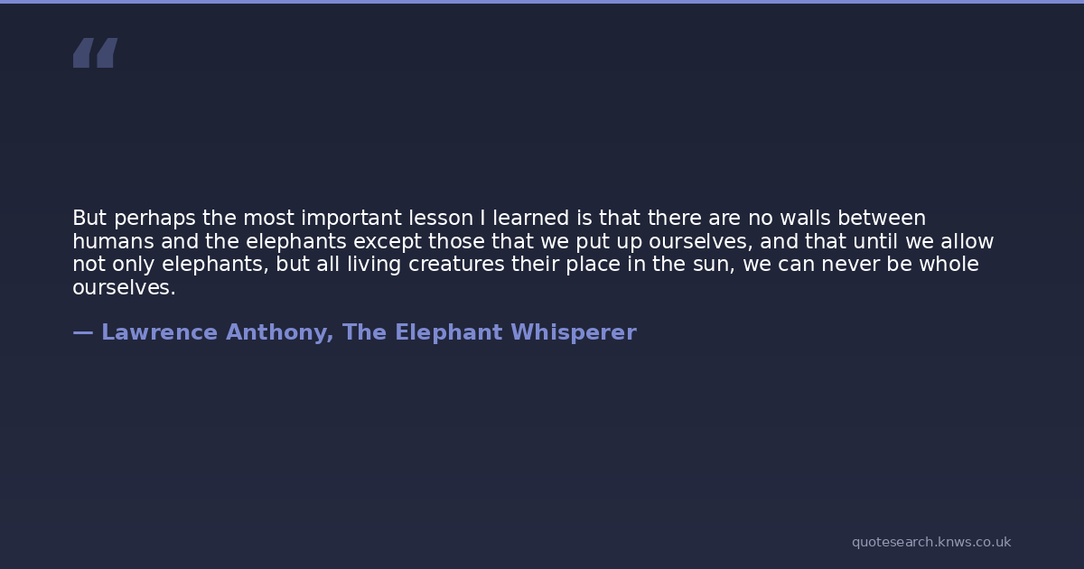 But perhaps the most important lesson I learned is that there are no walls between humans and the elephants except those that we put up ourselves, and that until we allow not only elephants, but all living creatures their place in the sun, we can never be whole ourselves.
