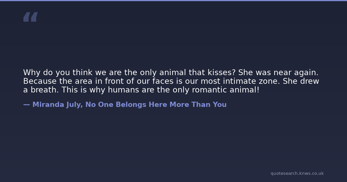 Why do you think we are the only animal that kisses? She was near again. Because the area in front of our faces is our most intimate zone. She drew a breath. This is why humans are the only romantic animal!