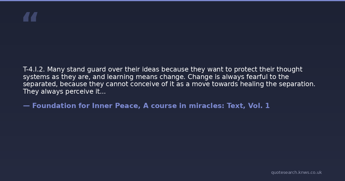 T-4.I.2. Many stand guard over their ideas because they want to protect their thought systems as they are, and learning means change. Change is always fearful to the separated, because they cannot conceive of it as a move towards healing the separation. They always perceive it as a move toward further separation, because the separation was their first experience of change.
