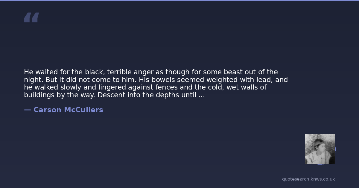 He waited for the black, terrible anger as though for some beast out of the night. But it did not come to him. His bowels seemed weighted with lead, and he walked slowly and lingered against fences and the cold, wet walls of buildings by the way. Descent into the depths until at last there was no further chasm below. He touched the solid bottom of despair and there took ease.