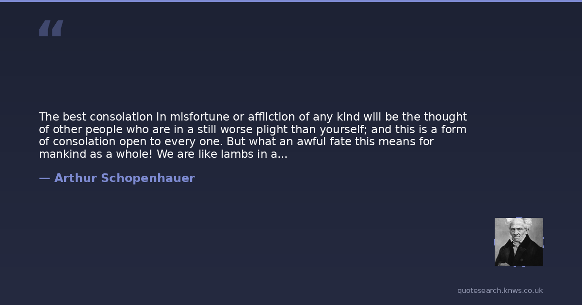 The best consolation in misfortune or affliction of any kind will be the thought of other people who are in a still worse plight than yourself; and this is a form of consolation open to every one. But what an awful fate this means for mankind as a whole! We are like lambs in a field, disporting themselves under the eye of the butcher, who chooses out first one and then another for his prey.