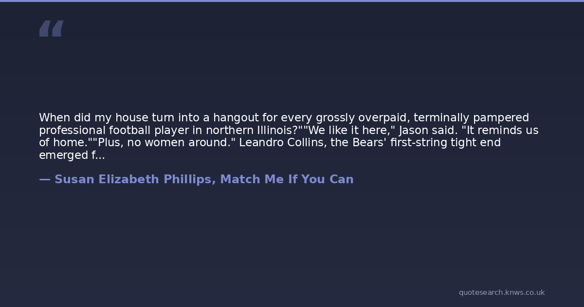 When did my house turn into a hangout for every grossly overpaid, terminally pampered professional football player in northern Illinois?""We like it here," Jason said. "It reminds us of home.""Plus, no women around." Leandro Collins, the Bears' first-string tight end emerged from the office munching on a bag of chips. "There's times when you need a rest from the ladies."Annabelle shot out her arm and smacked him in the side of the head. "Don't forget who you're talking to."Leandro had a short fuse, and he'd been known to take out a ref here and there when he didn't like a call, but the tight end merely rubbed the side of his head and grimaced. "Just like my mama.""Mine, too," Tremaine said with happy nod.Annabelle spun on Heath. "Their mother! I'm thirty-one years old, and I remind them of their mothers.""You act like my mother," Sean pointed out, unwisely as it transpired, because he got a swat in the head next.