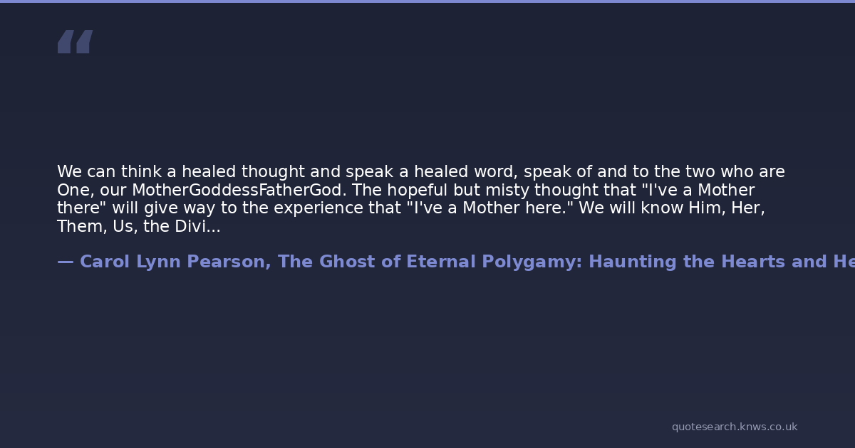 We can think a healed thought and speak a healed word, speak of and to the two who are One, our MotherGoddessFatherGod. The hopeful but misty thought that "I've a Mother there" will give way to the experience that "I've a Mother here." We will know Him, Her, Them, Us, the Divine Family unbroken, bringing part to whole and whole to part, singing the indispensable She who had been forgotten but it now found, singing the wholeness, singing the holiness.