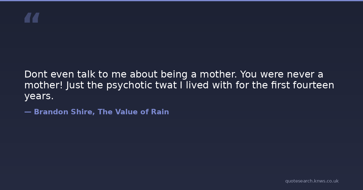 Dont even talk to me about being a mother. You were never a mother! Just the psychotic twat I lived with for the first fourteen years.